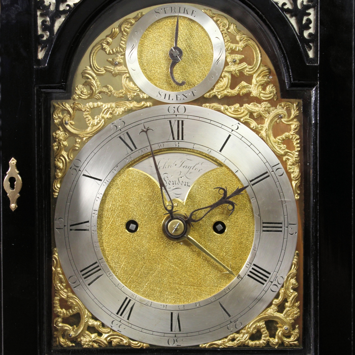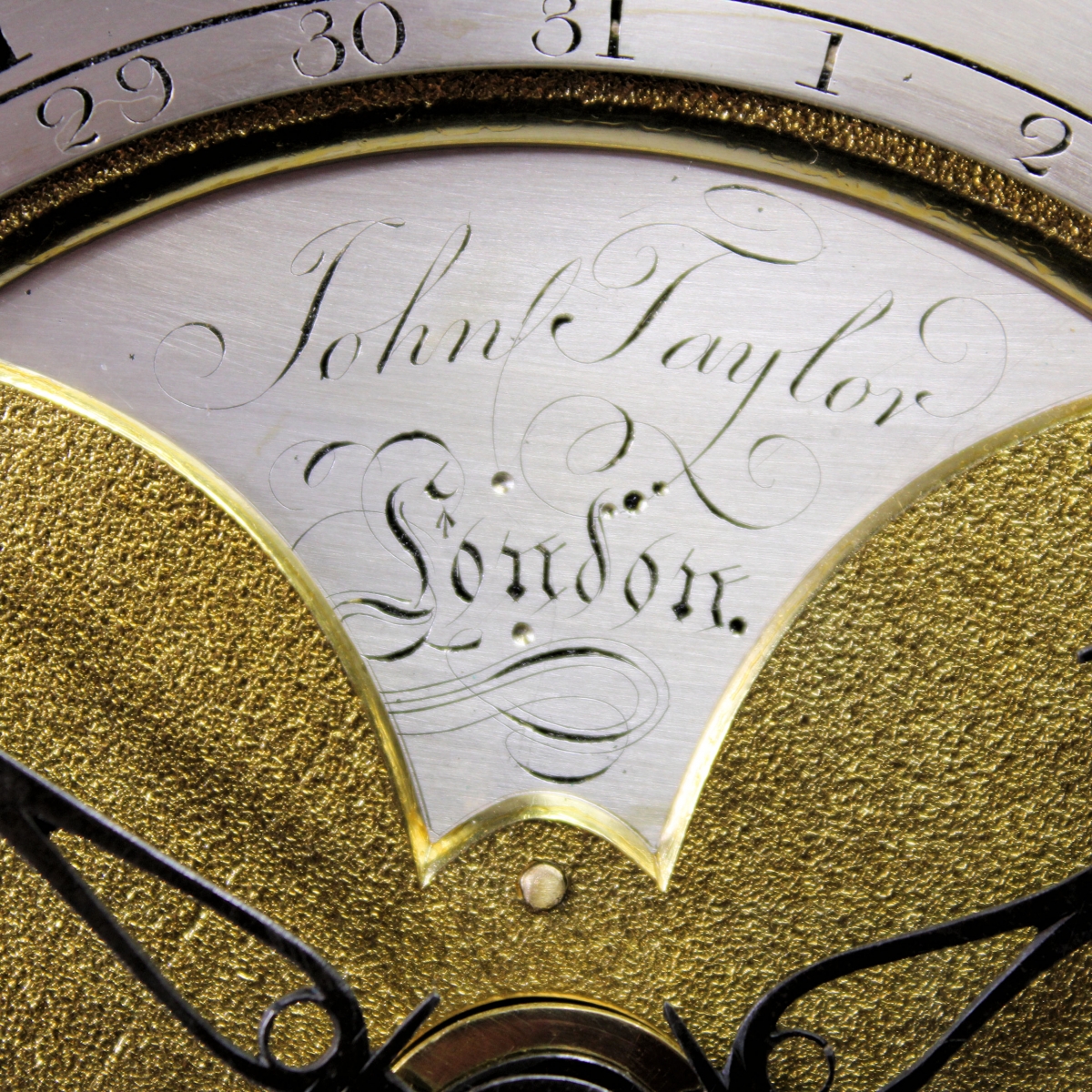 Behind a 6" wide, break-arch brass dial with cast brass Rococo style spandrels, silvered strike/silent select chapter to the arch with a matted centre, silvered main chapter ring with small Arabic outer 5’s minute track, short Roman hour numerals and inner, Arabic calendar date numerals. The finely matted centre has an axe-head aperture at the top bearing a rear-mounted and silvered makers plate of exceptional quality bearing the name “John Taylor (of) Londonâ€. The well-cut hour, minute and strike select hands are blue steel and the centre-sweep calendar hand is polished brass with an arrow tip.