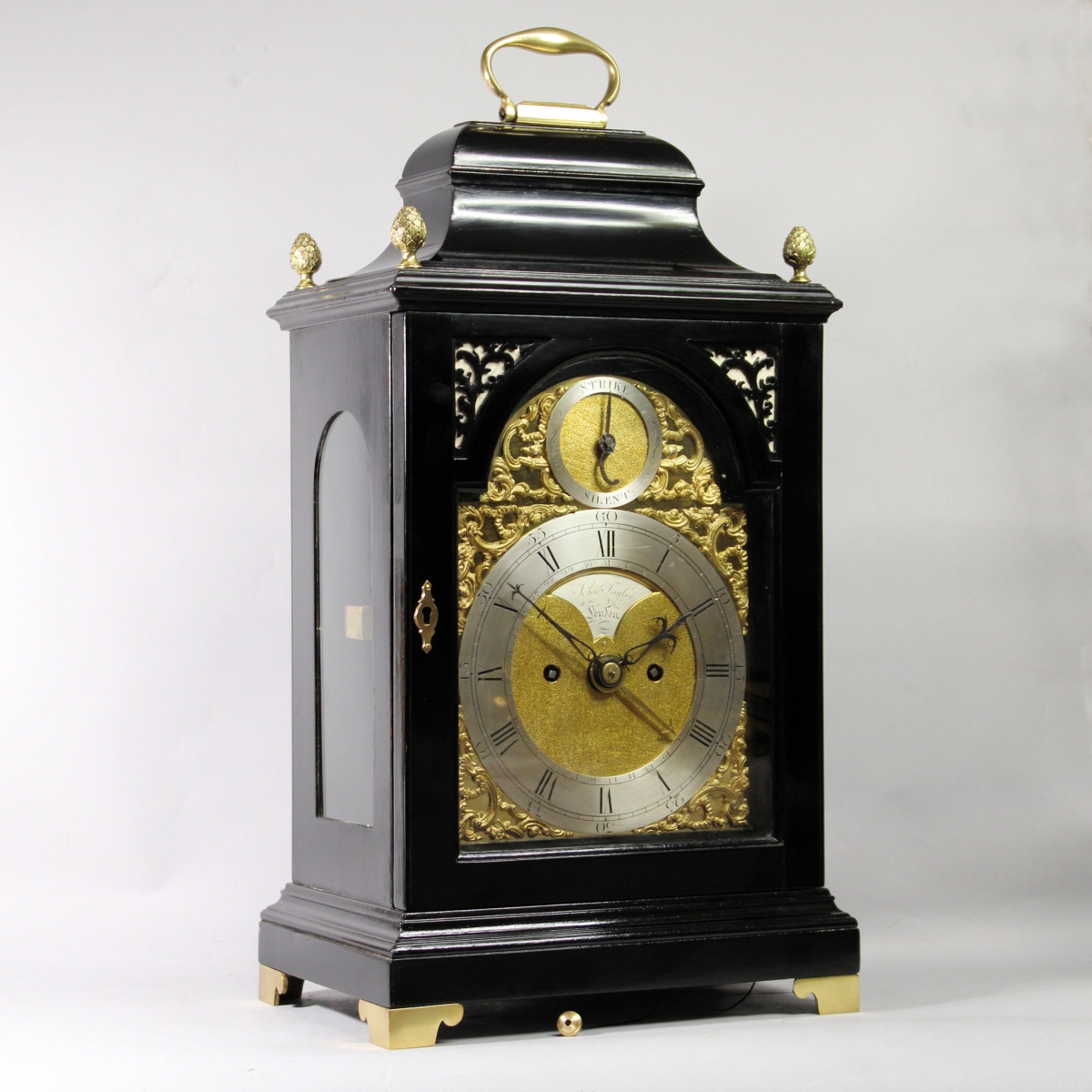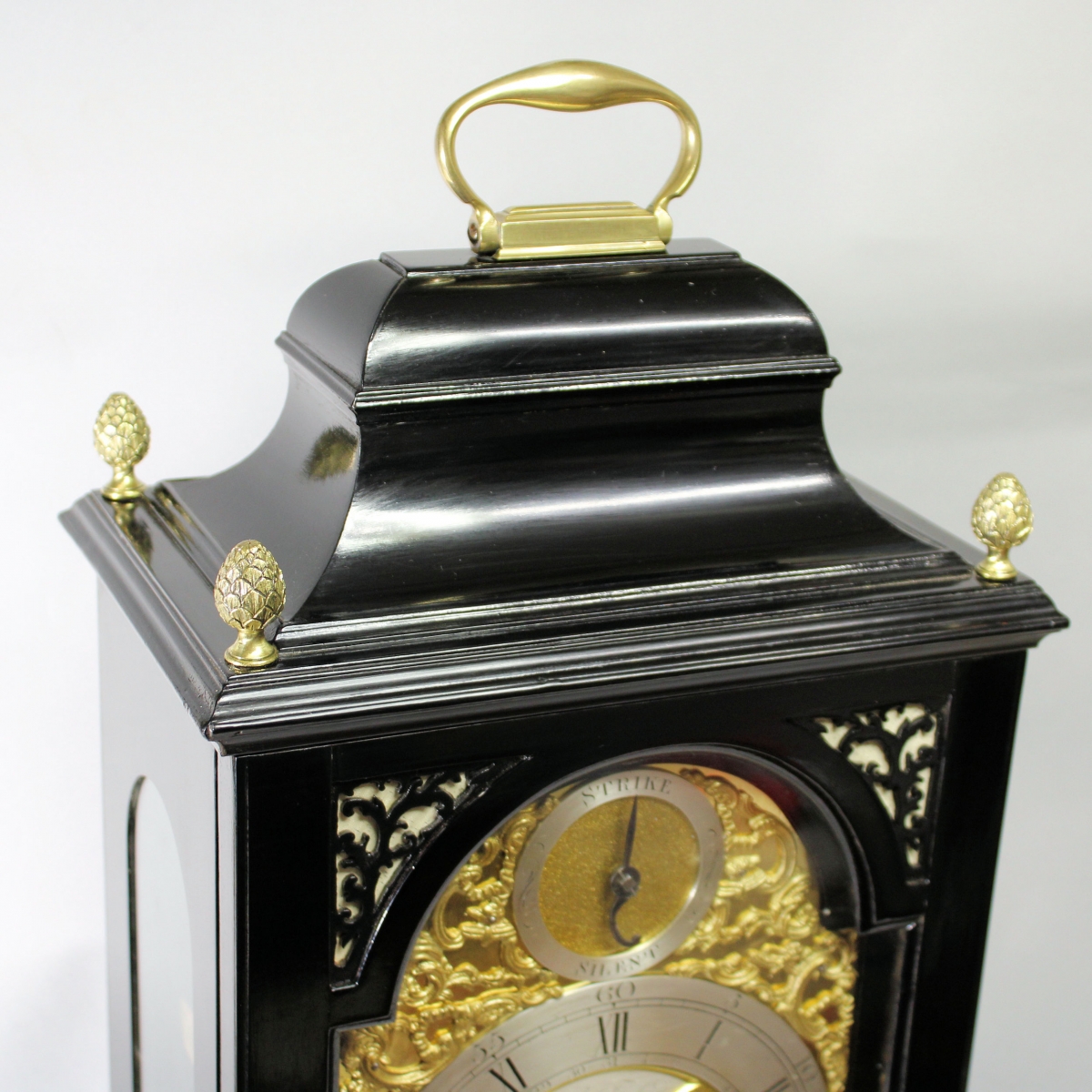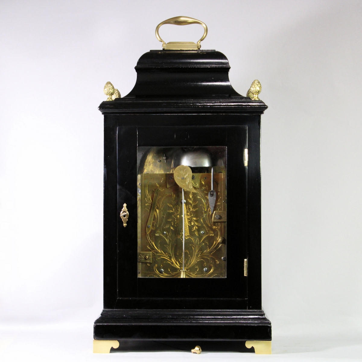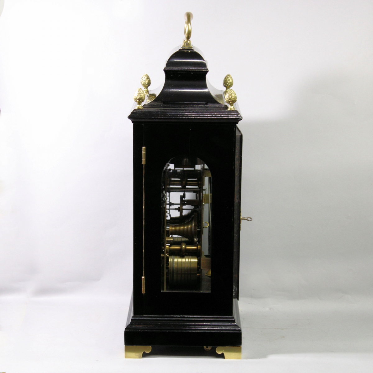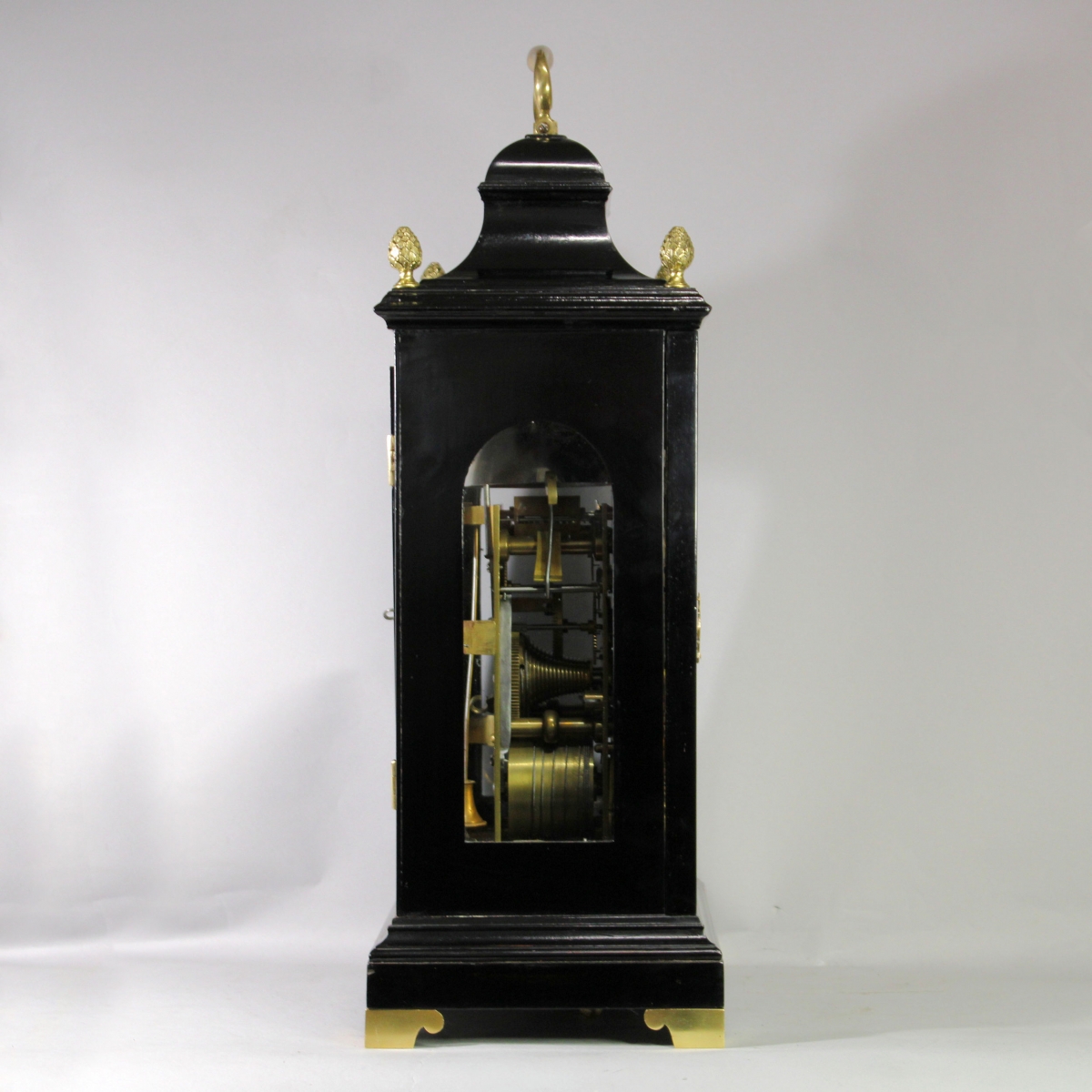 Contained in an ebonised bell-top case. The top has a cast brass, swinging carrying handle and each corner has a cast brass pineapple finial. The returned all-around top moulding sits over the full-size locking and glazed front door with cloth backed wooden sound frets to the arch quadrants and a brass key escutcheon. The case sides have tall, arched glazed apertures and the rear has a rectangular glazed and locking door. The all-around short plinth has a top moulding and sits upon 4 cast brass shaped and flat-sided feet. The strike repeating pull exits the case from the bottom.
