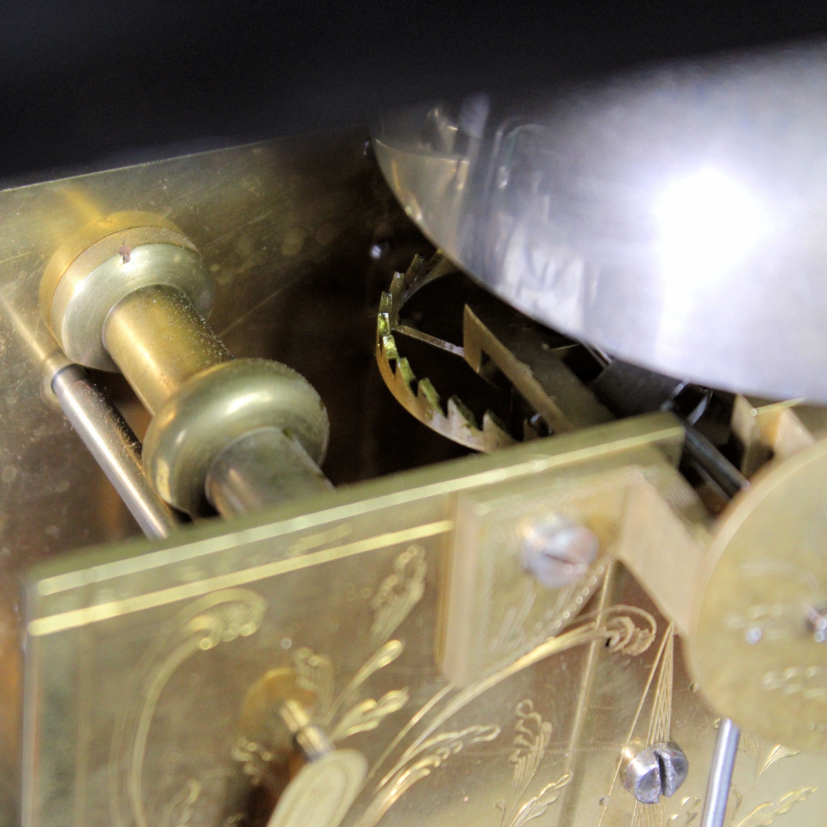 The 8 day duration, 5 knopped pillar, double fusee movement with attached pendulum Verge escapement. Also having strike/silent, pull repeating rack and star-wheel striking the hours and half hour striking on a top-mounted bell, fully engraved backplate, backcock, tear-shaped apron, select return spring and fixing brackets. The engraving is in ‘high floral Rococo’ style.