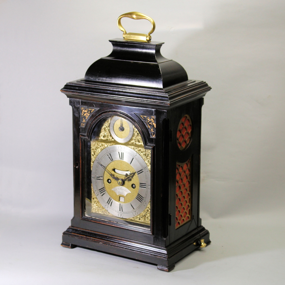 In an ebonised fruitwood veneered oak case with an inverted bell top on which is mounted a cast brass, swinging carrying handle. The return-moulded top sits over the full-sized locking front door that has quadrant sound frets to the upper arch sides. The side apertures retain their original, tall, inverted-arched, cast brass 'fish scale' sound frets that sit below round frets and are backed with red cloth. The rear of the case has a rectangular and glazed locking door. The short plinth has all-round concave top moulding and short block feet to the corners. The repeat pull exits from the right side.