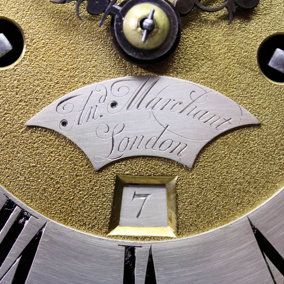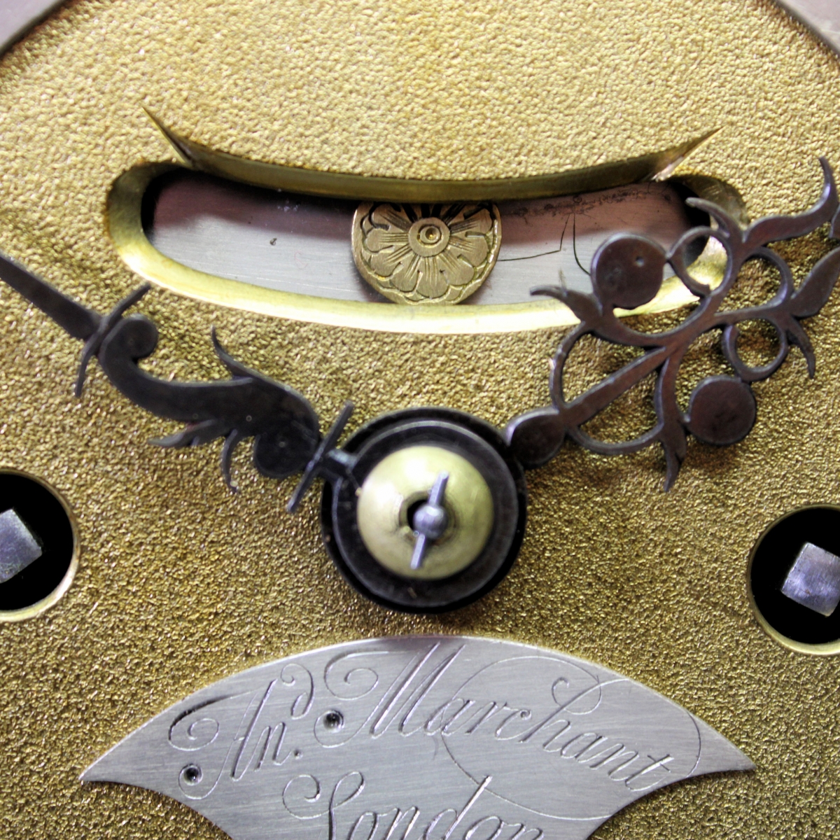 Behind a small 5 7/8" wide, brass break-arch dial with early Rococo style cast brass corner and arch spandrels, finely matted chapter centres to the silvered strike/silent chapter ring in the arch and the main silvered chapter ring with large outer, Arabic fives, minute track and inner Roman hour numerals. The lower dial centre having a nicely executed, curved and silvered maker's name plate bearing "An.d(rew) Marchant" (of) "London" in fine, script. Below this is a square and chamfered calendar date aperture. Above the centre is a curved and chamfered 'false pendulum' aperture with a silvered backplate, the circular bob is engraved with a rose design. The blued steel hands are finely pierced with a 'poker' selector hand to the arch for the strike/silent.