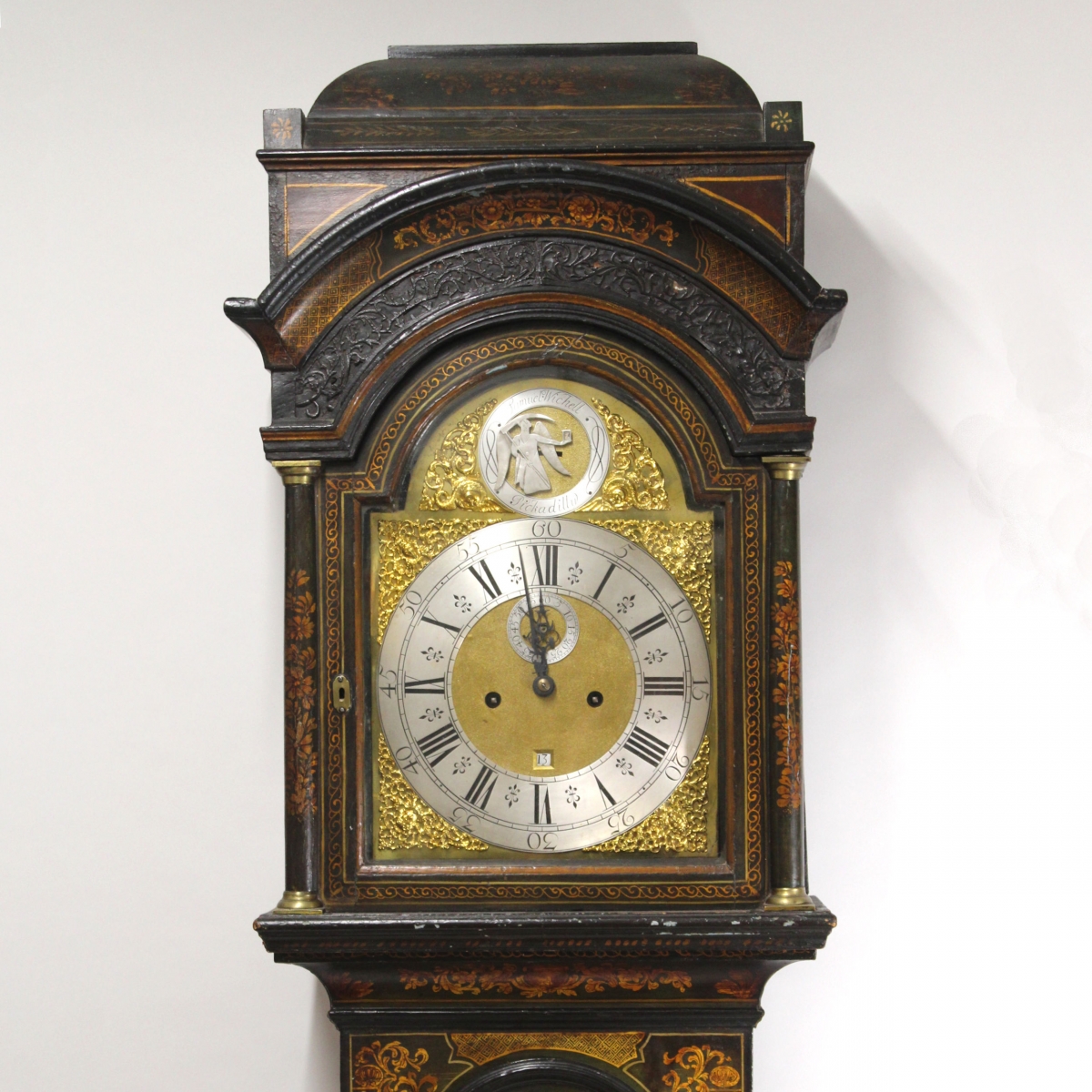 Twelve inch wide, break-arch brass dial with 'Indian's Head' cast brass spandrels to the corners and 'Sea serpent' ones to the arch that flank a silvered circular ring bearing the maker's name of "Samuel Wichell" and "Pickadilly" (London). This encircles a matted centre and a moving, two-piece, silvered figure of 'Father Time' with wings, hourglass and Scythe. The main silvered chapter ring has inner quarters, Roman hour numerals with fluer-de-lys half markings, minute ring and outer Arabic numerals marking the five minute intervals. The matted centre has a silvered subsidiary seconds ring to the upper portion and lower, square chamfered calendar date aperture. The hands are blued steel of which the hour hand may be a replacement.