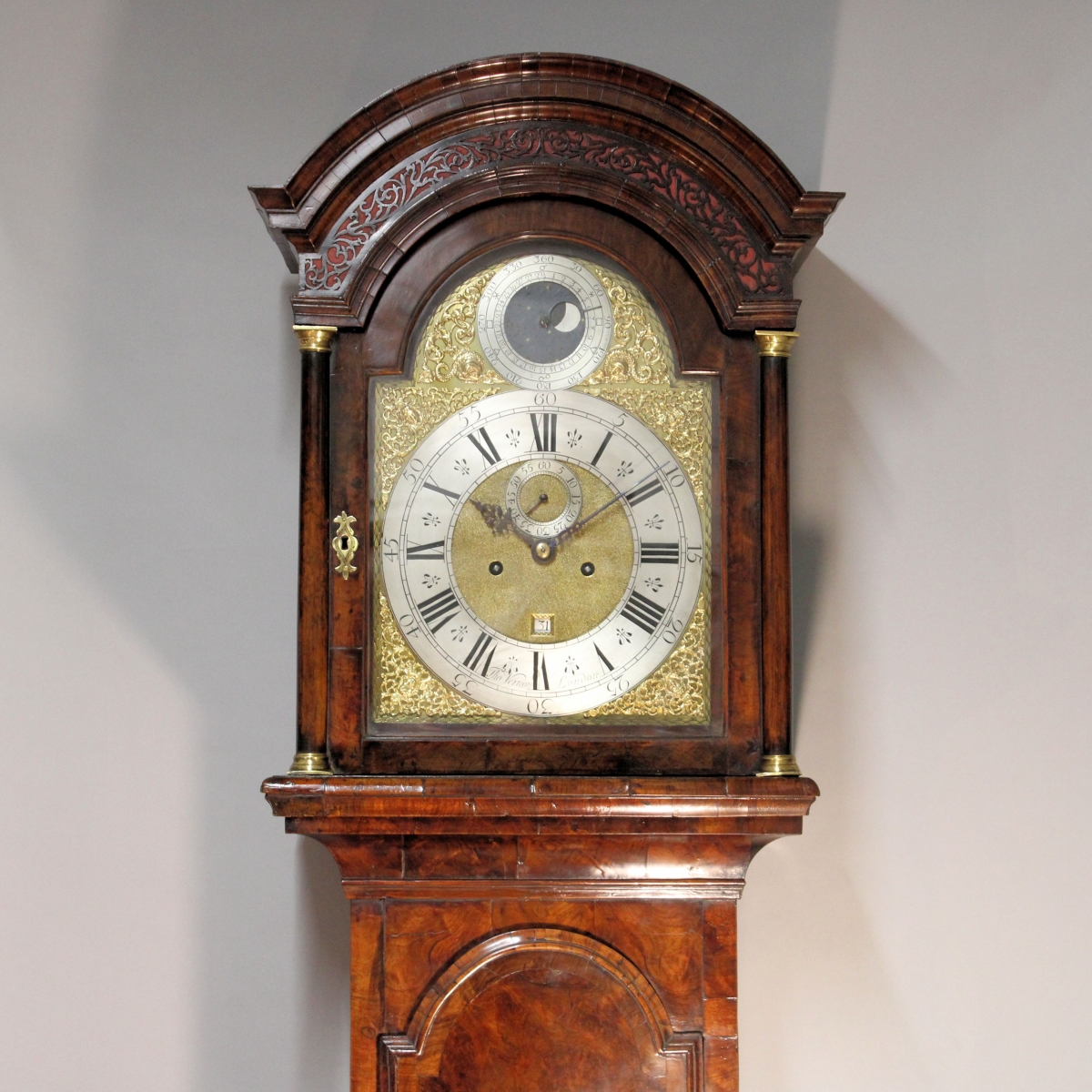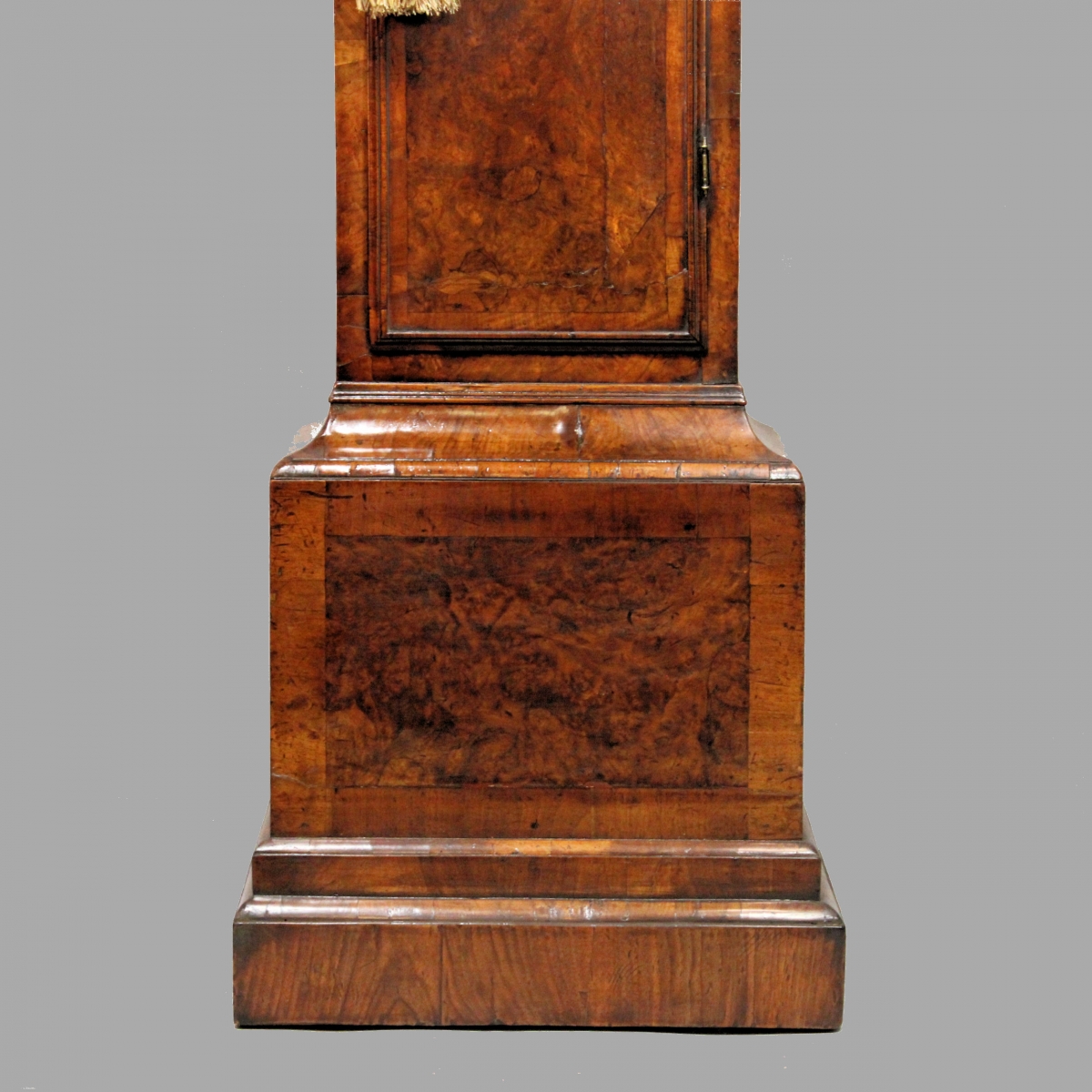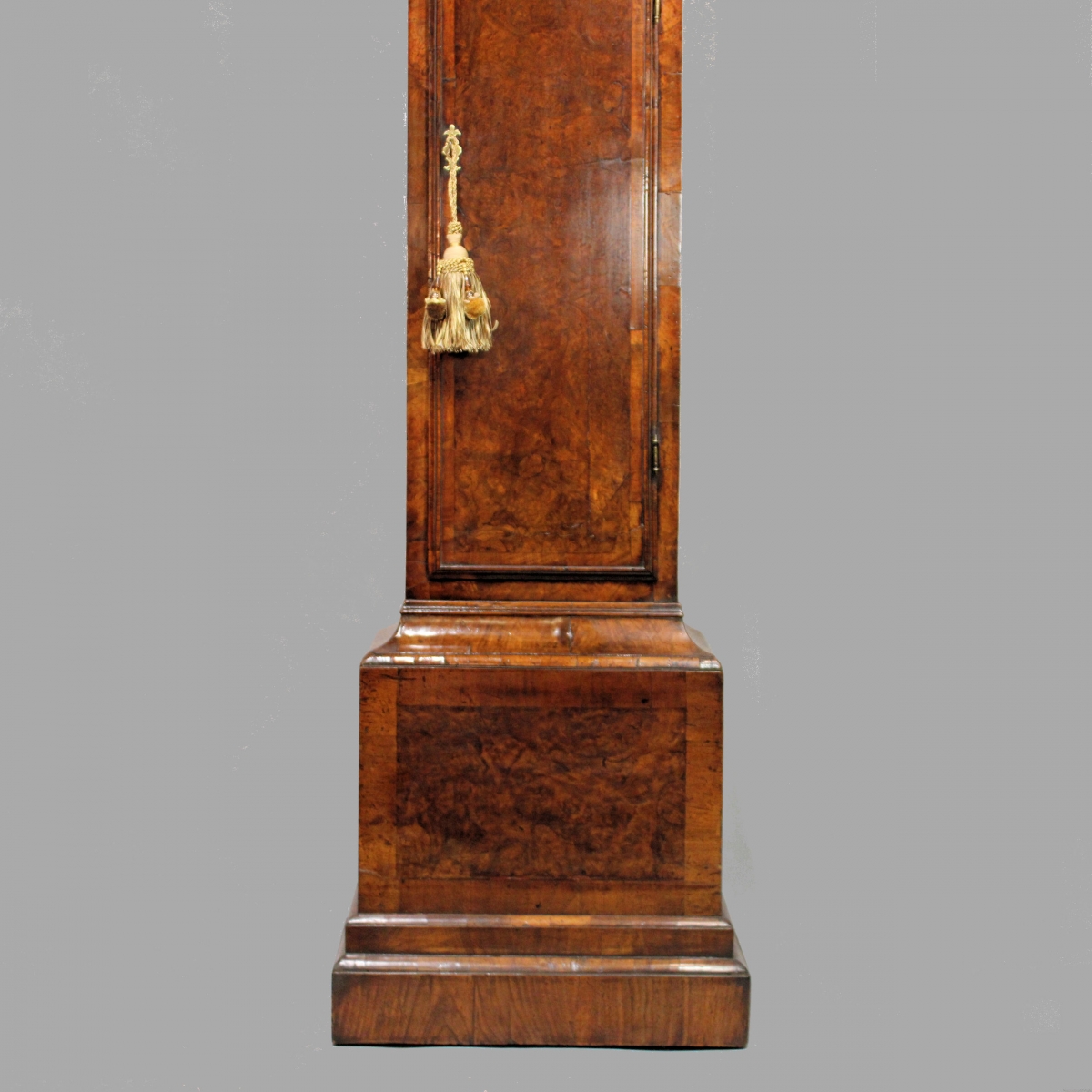 Contained in a fine quality and imposing walnut case. The break-arch hood has a full, crossgrain and elaborated top moulding. This is over a frieze the front of which carries a cloth-backed scrolled fret. The full-size and locking door to the hood has integral and slightly tapered pillars that have brass capitals, these are mirrored by way of quartered pillars that are fixed to the rear ears. The sides have tall viewing apertures that are glazed through which the movement can be seen. The lower covering moulding is also crossgrained and is well executed. The hood slides over a large Cavetto throat to the trunk and the locking door is full-length with a break-arch top. It has a burr walnut front that is crossbanded and edged with a fine, elaborate moulding. The trunk sides are panelled and it sits upon a complimenting moulding over a large Cavetto moulding adjoining the base. This too has a burr front that is crossbanded. The plinth is the classic 'Double London' type of high quality and strength and supports the case perfectly.