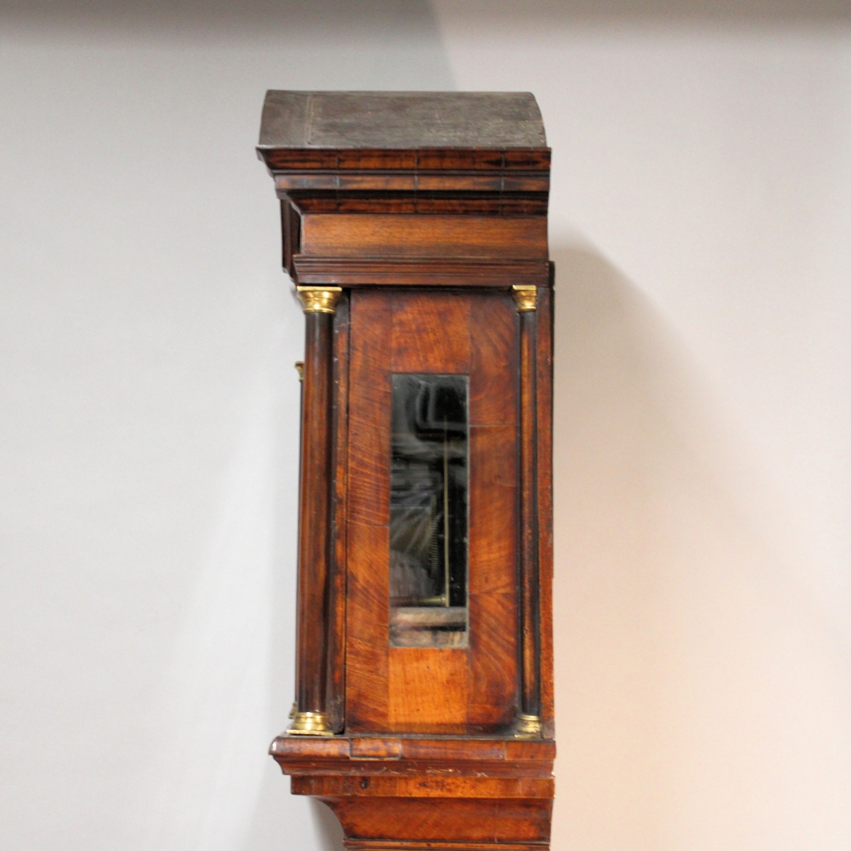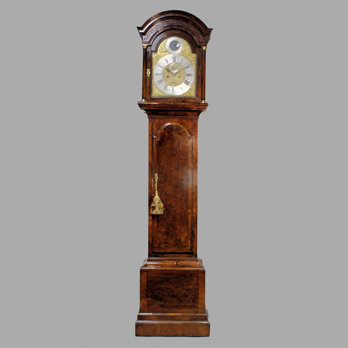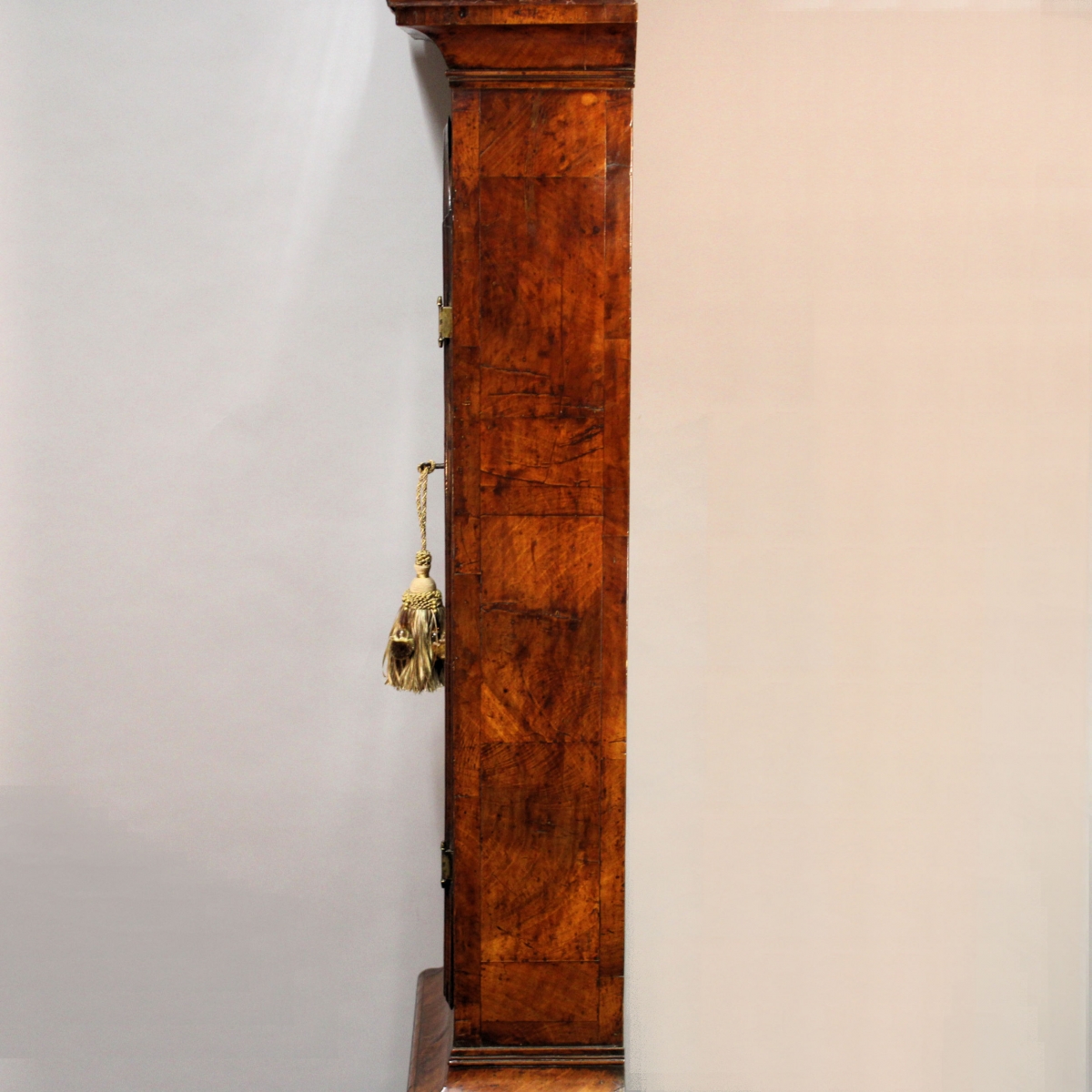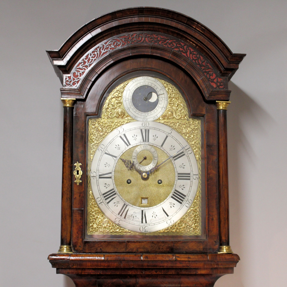 Contained in a fine quality and imposing walnut case. The break-arch hood has a full, crossgrain and elaborated top moulding. This is over a frieze the front of which carries a cloth-backed scrolled fret. The full-size and locking door to the hood has integral and slightly tapered pillars that have brass capitals, these are mirrored by way of quartered pillars that are fixed to the rear ears. The sides have tall viewing apertures that are glazed through which the movement can be seen. The lower covering moulding is also crossgrained and is well executed. The hood slides over a large Cavetto throat to the trunk and the locking door is full-length with a break-arch top. It has a burr walnut front that is crossbanded and edged with a fine, elaborate moulding. The trunk sides are panelled and it sits upon a complimenting moulding over a large Cavetto moulding adjoining the base. This too has a burr front that is crossbanded. The plinth is the classic 'Double London' type of high quality and strength and supports the case perfectly.