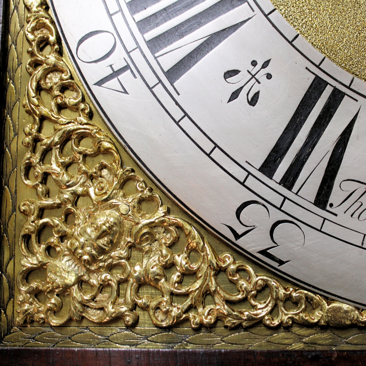 Behind a 12" wide, brass break-arch dial. The dialplate has triple wheat-ear border engraving. The 4 corner spandrels are cast brass 'Indian's head' style and the arch spandrels depict sea serpents or stylised dolphins and flank a silvered, astronomical chapter with outer days of the year, 8 astronomical signs and inner days of the age of the present moon. The centre of it bears a slowly revolving blue disc with stars representing the night sky also, a 'penny moon' aperture that displays the diagrammatic state of the moon. The broad, main chapter ring has outer, Arabic 5's, a divided minute track, Roman hour numerals, an inner, divided quarter track and Fleur-de-Lys half hour marks. The maker's signature; "Tho(mas) Vernon (of) London" flanks the hour numeral VI. The matted dial centre has an upper silvered subsidiary seconds ring with outer Arabic 5's and the lower centre has a square, chamfered and cross-hatched calendar date aperture. The pierced and cut hands are blued steel.