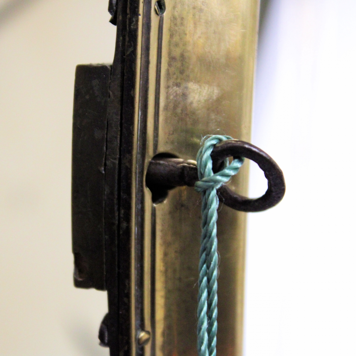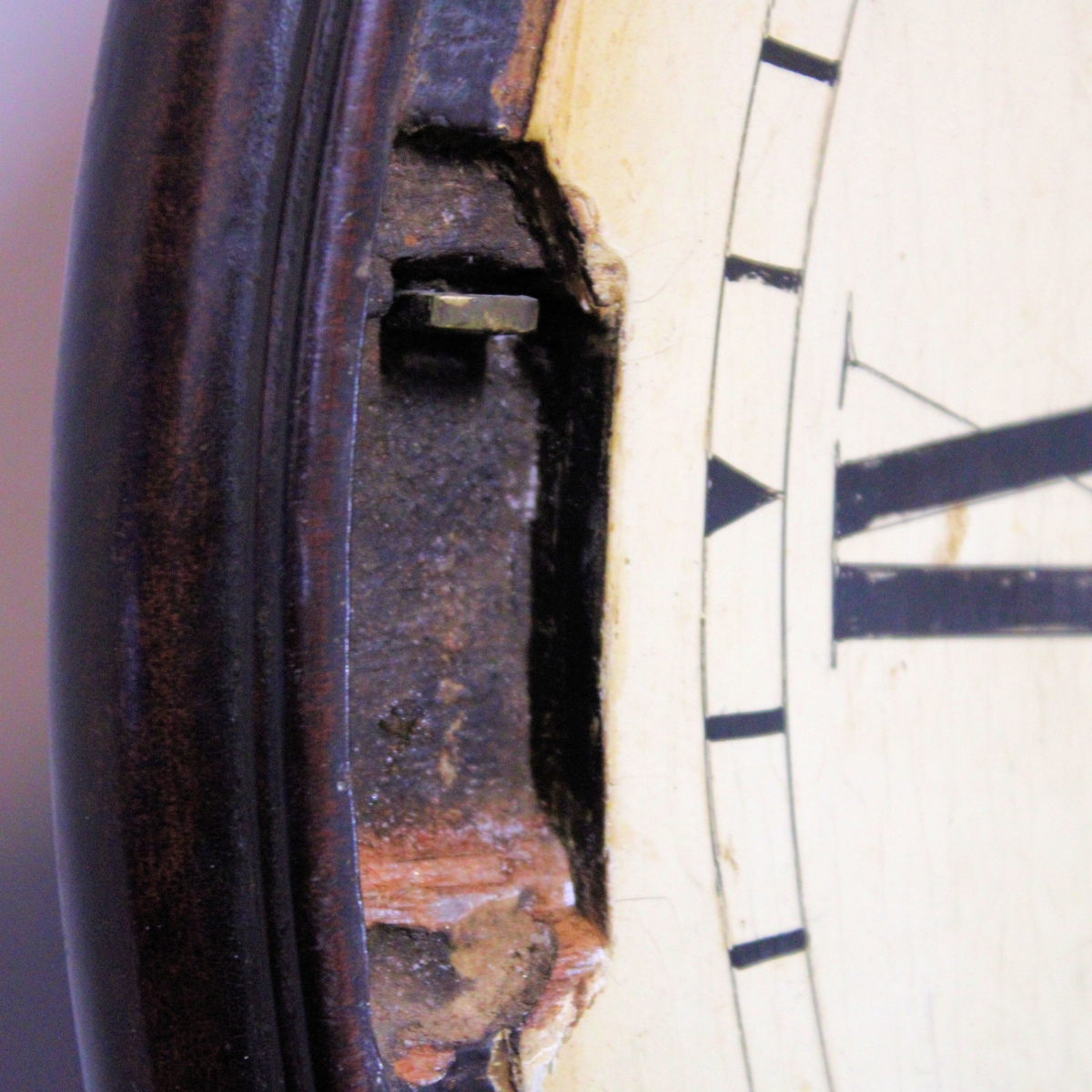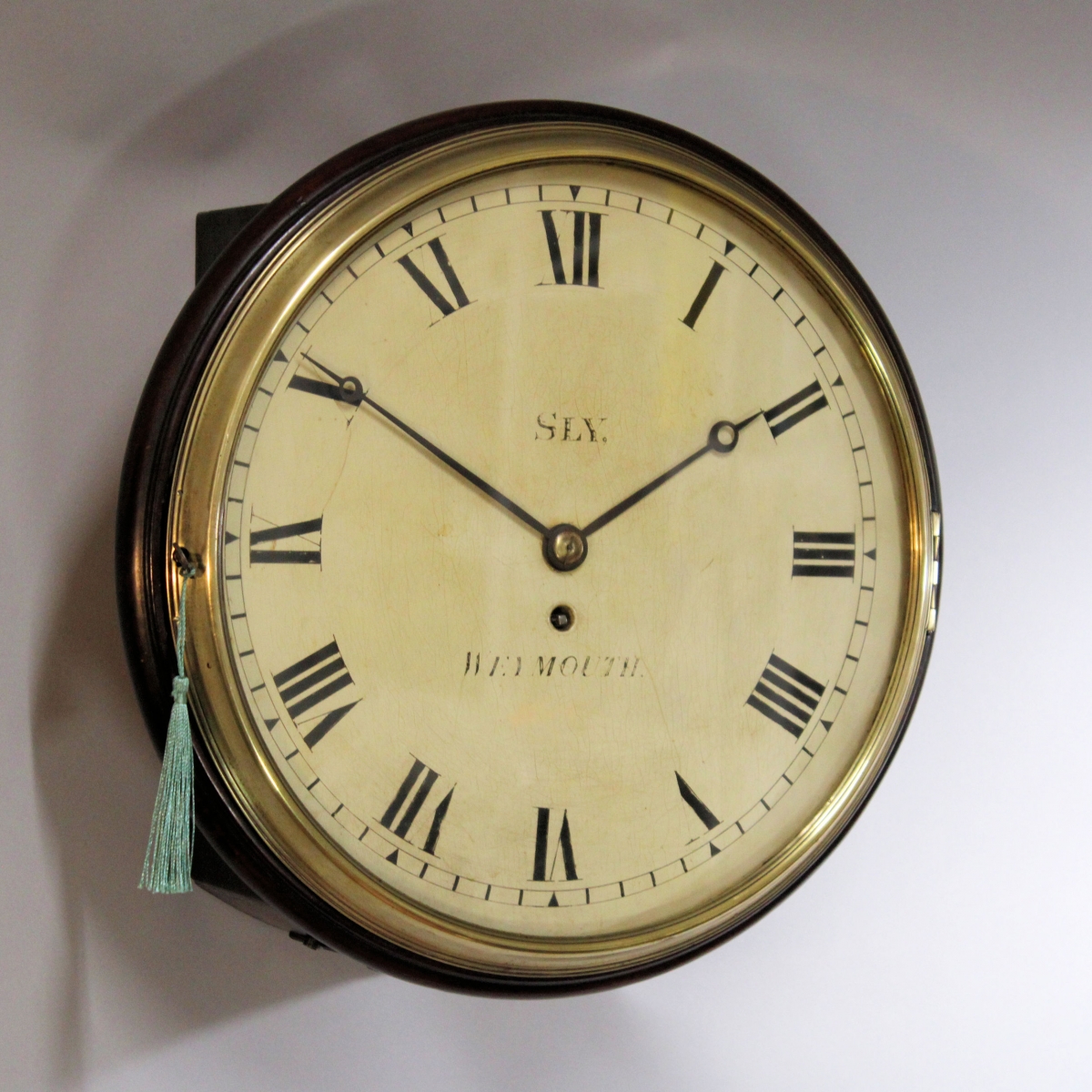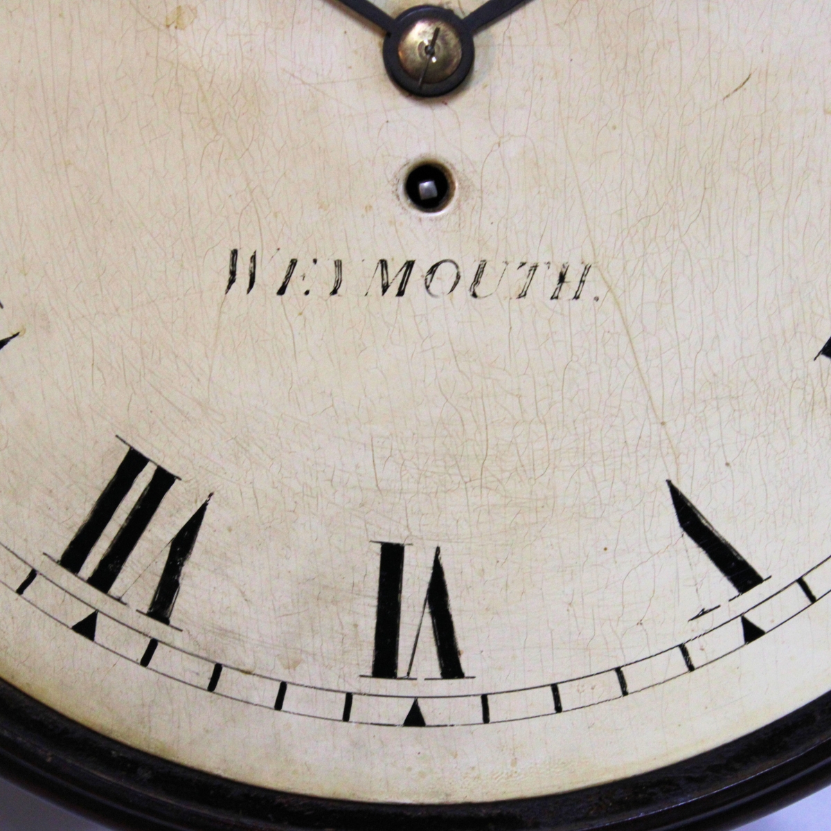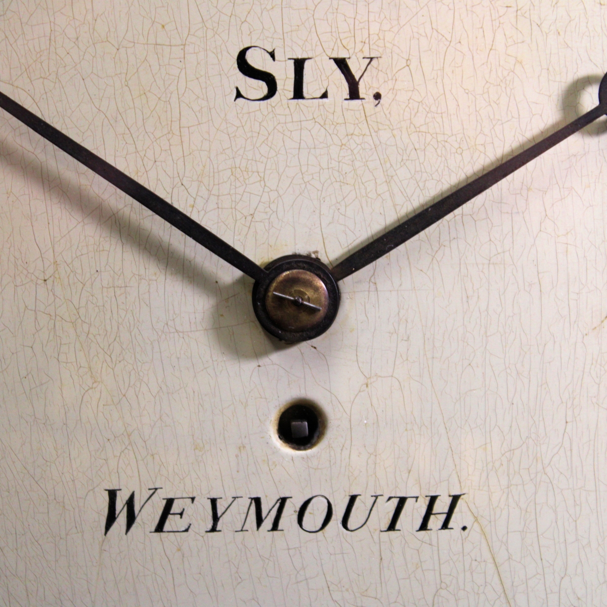 Behind a 12" diameter flat wooden dial with its original paint. The cream coloured background has an inked outer minute track and short Roman hour numerals. Above the centre is the maker's name of "SLY" and below is the place "WEYMOUTH". The open moon hands are matching and the dial is behind a locking, cast brass 'Sheraton' style concave bezel with flat glass.