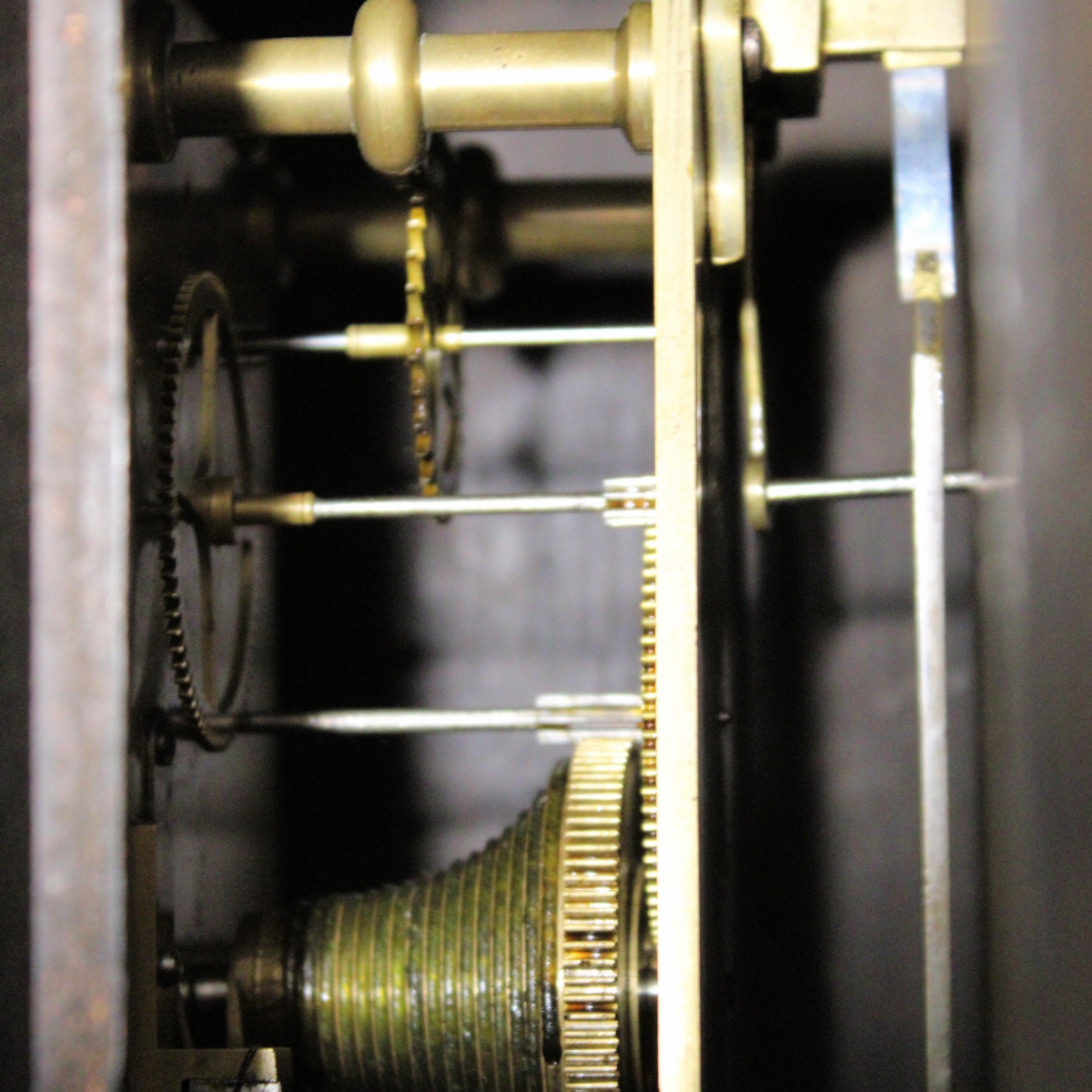 The 8 day duration, gut fusee movement with tapered plates, knopped pillars and Anchor Recoil escapement. Also having a substantial pendulum and unusually, a transit locking bracket.