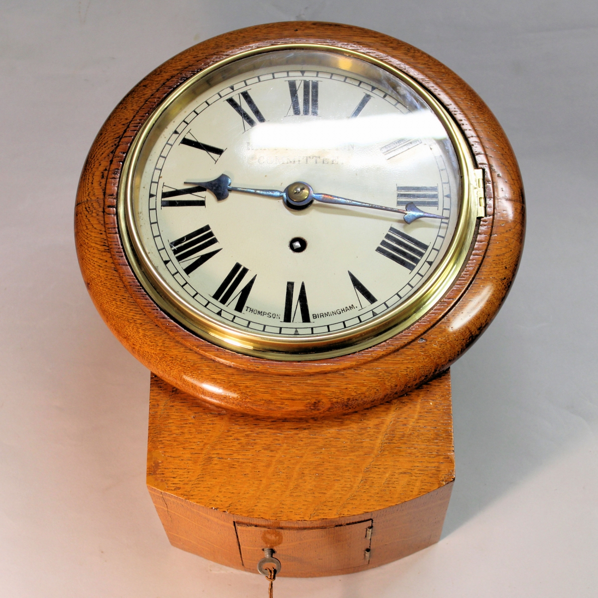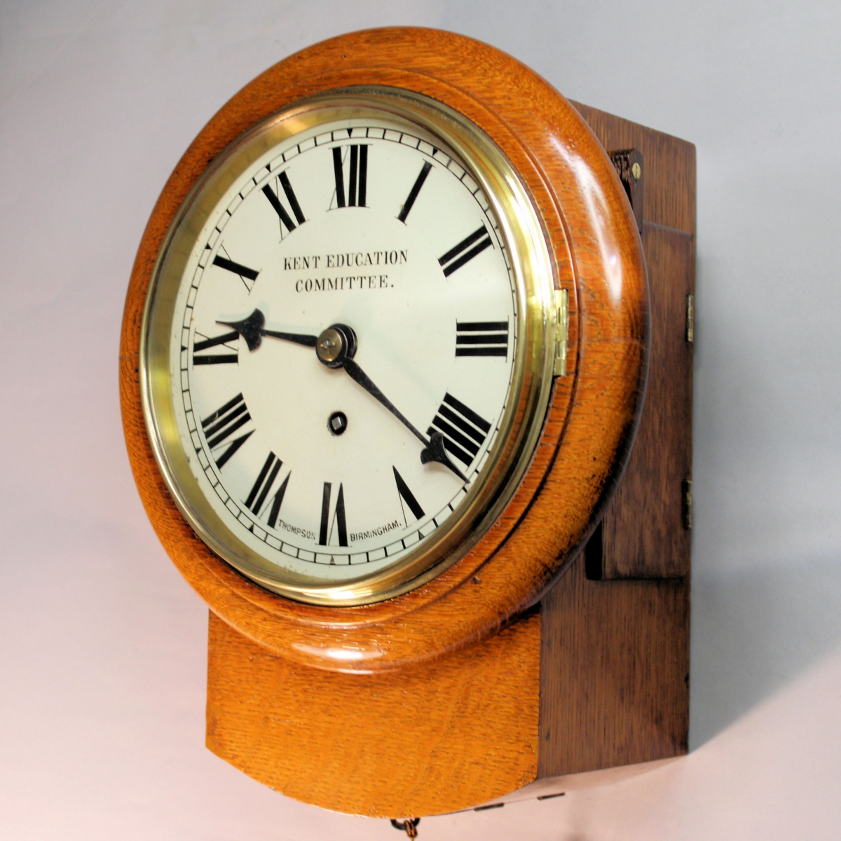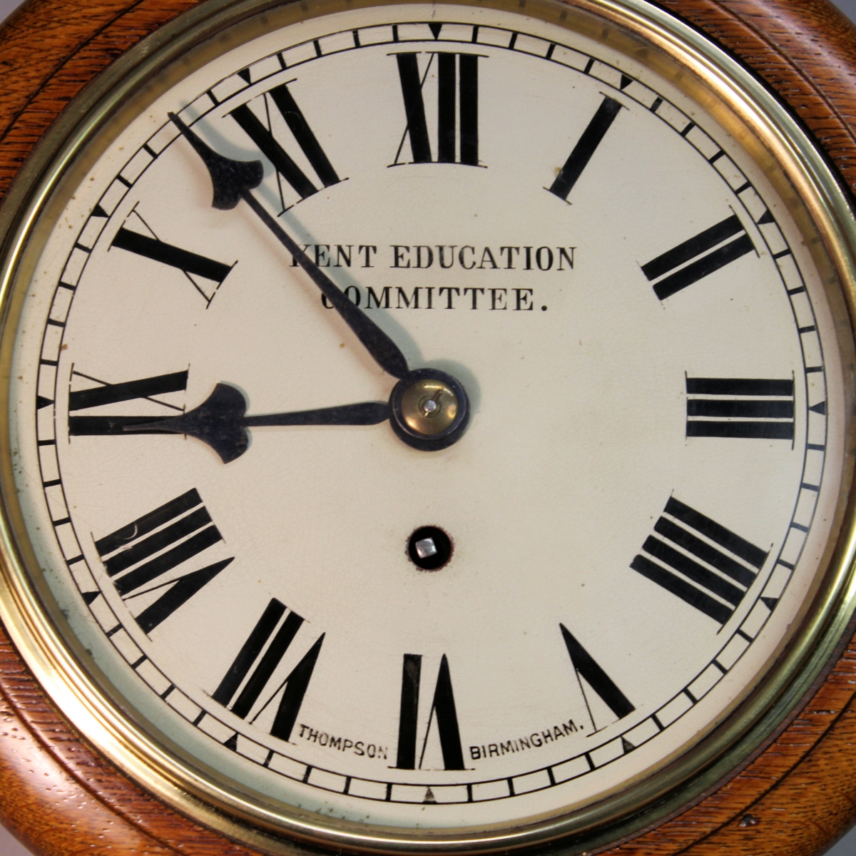 Behind a 7 1/2" visible, painted iron dial that retains its original paint. Having an outer, divided minute track and hour triangular markings, Roman hour numerals and the upper centre portion bearing "KENT EDUCATION COMMITTEE". The numeral VI is flanked with the maker's name of "THOMPSON (of) BIRMINGHAM". The matching 'arrow head' hands are of blued steel.