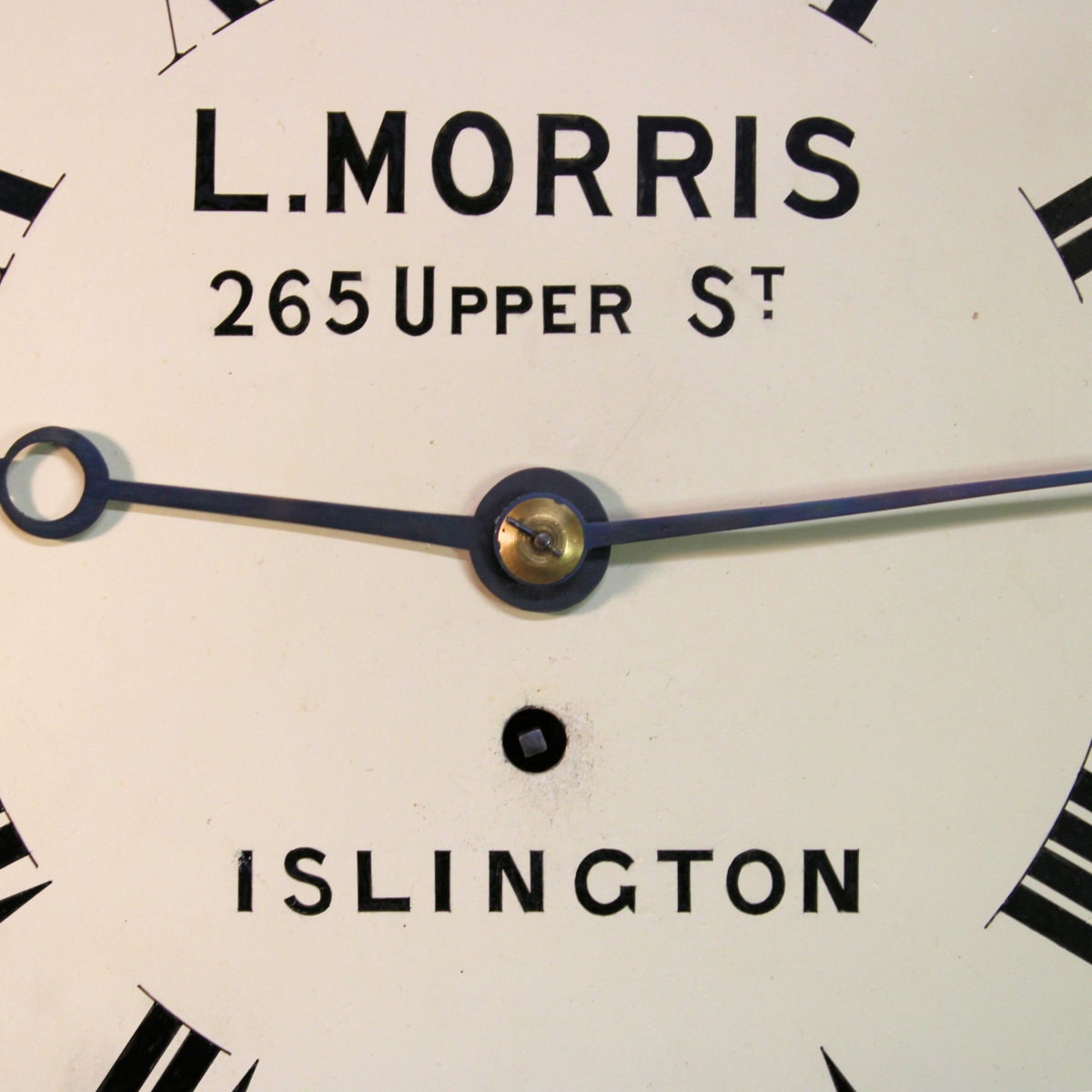 Behind a 12" diameter, painted iron flat dial with an outer divided minute track with triangular hour marks, Roman hour numerals and the centre boldly displaying the maker's signature of "L. MORRIS. 265 UPPER ST. ISLINGTON". Also having 'open moon' style matching blued steel hands. Under a cast brass hinged bezel with sight ring and thick bevelled flat glass.