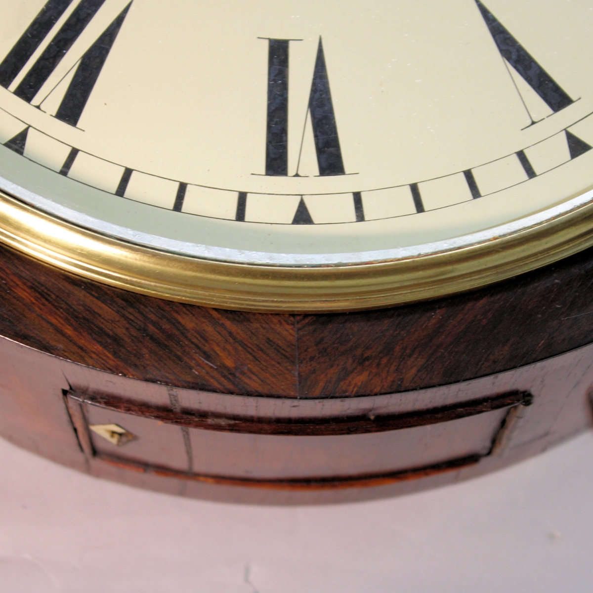 In a well-figured and very well laid rosewood veneered oak 'Drum' case with locking and cockbeaded doors to the bottom for regulation and the left side for access to the bezel release. If the doors are locked, the clock cannot be tampered with!
