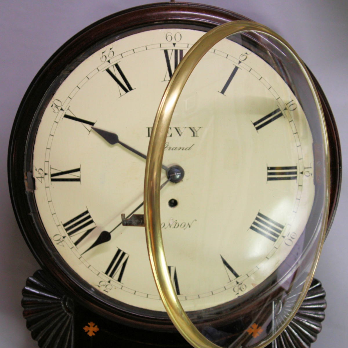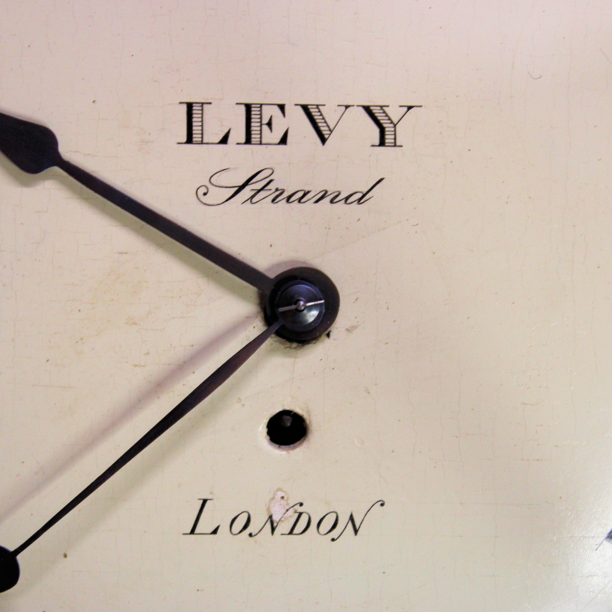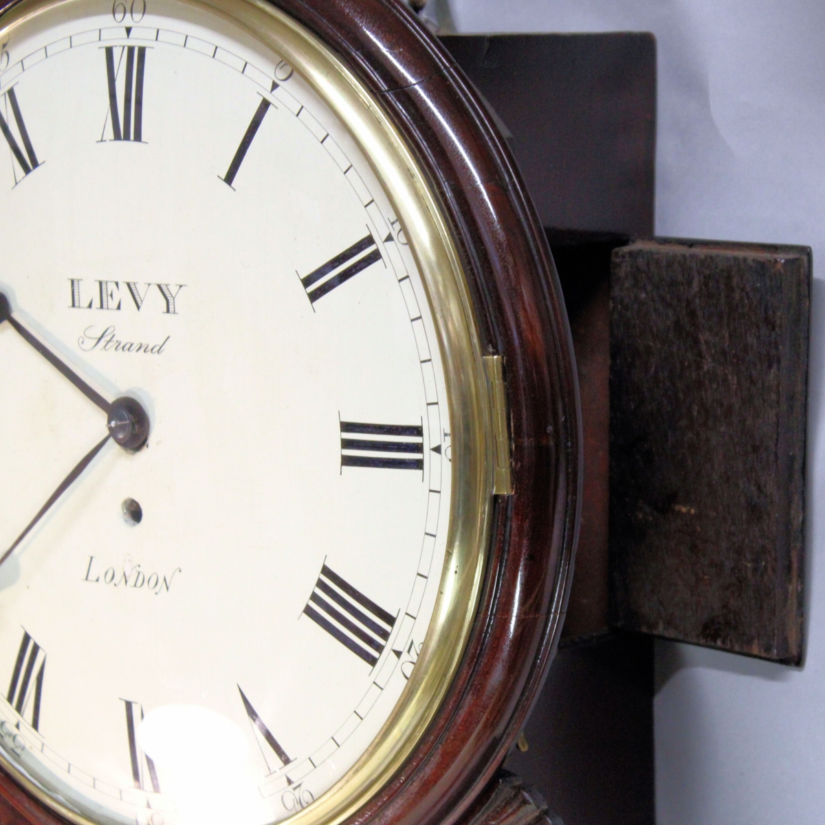 Fixed to a bridge plate behind a 12" diameter, convex wooden dial that is separate to the surround (this is very rare and dates the clock accurately). Having outer, Arabic 5's, a divided minute track with triangular hour marks, Roman hour numerals and above centre is the maker's name "LEVY (of the) Strand" and below the winding hole - the city; "LONDON". The hands are matching 'spade' style and are blued steel. The dial is behind a polished, cast brass, hinged bezel with a high dome, convex glass.