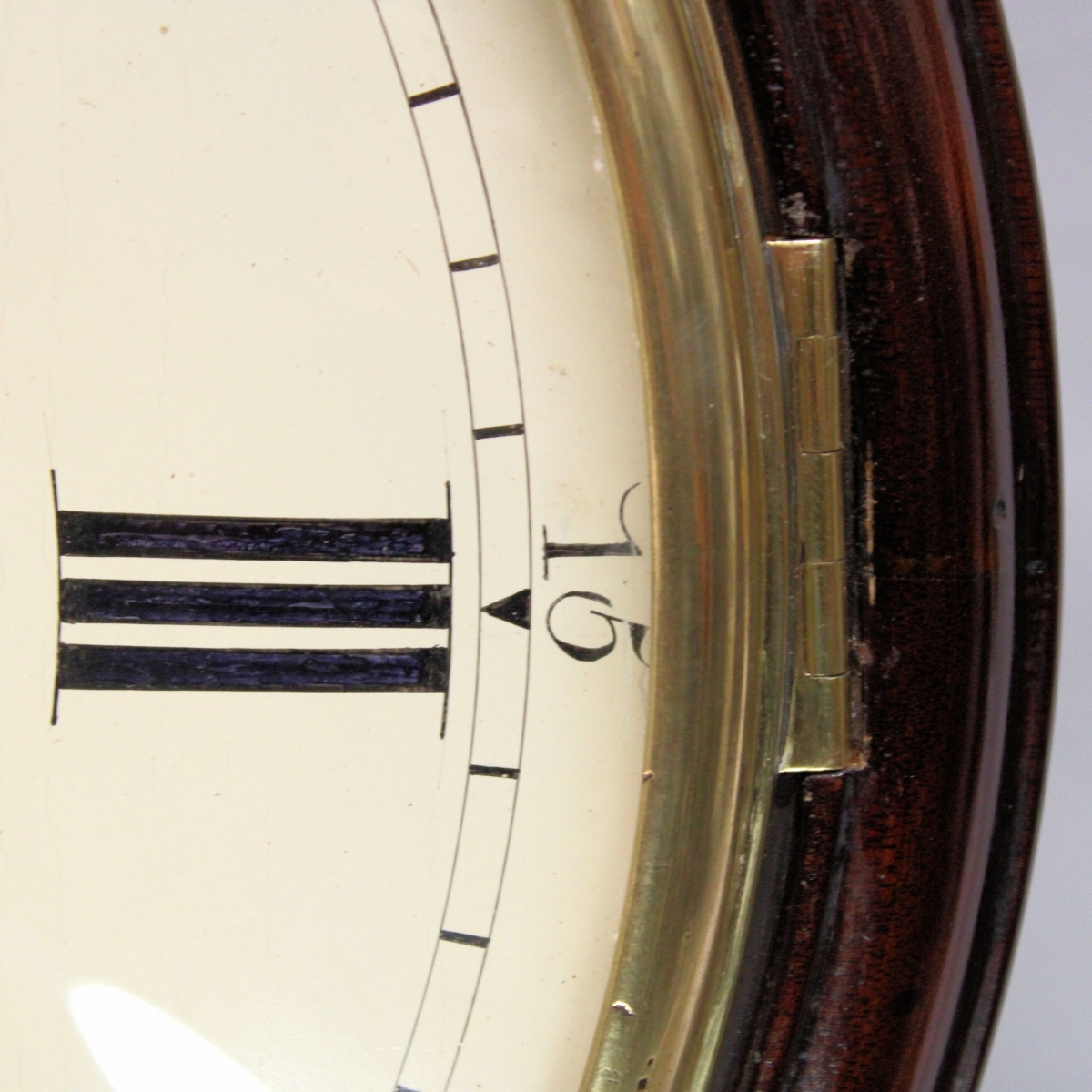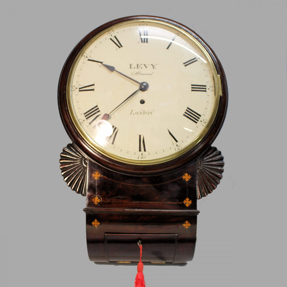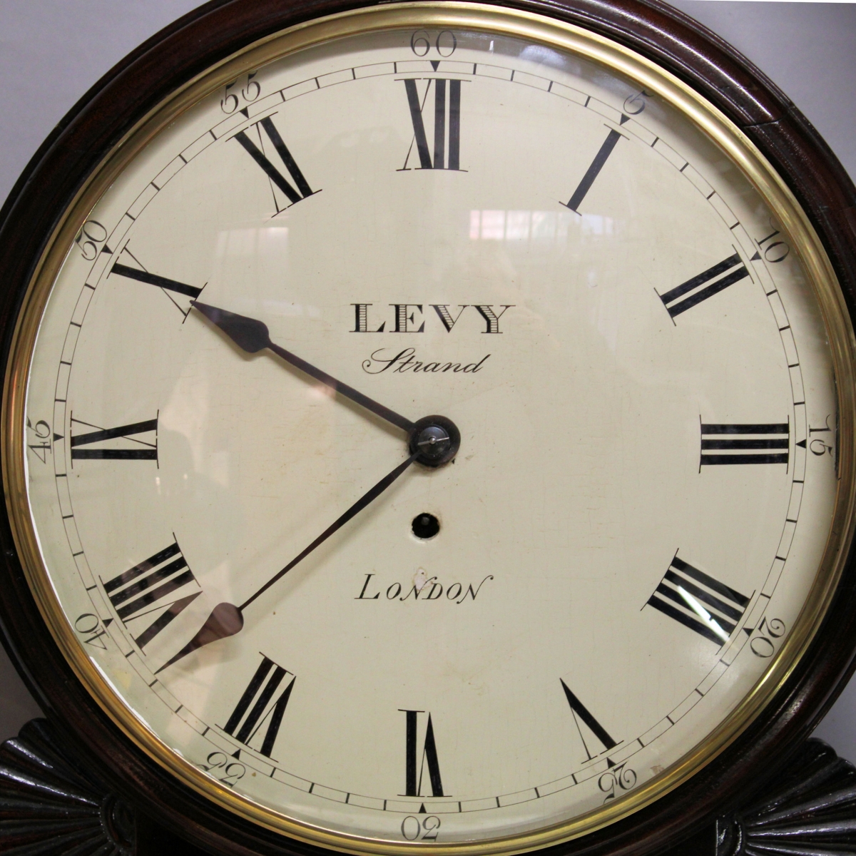 Fixed to a bridge plate behind a 12" diameter, convex wooden dial that is separate to the surround (this is very rare and dates the clock accurately). Having outer, Arabic 5's, a divided minute track with triangular hour marks, Roman hour numerals and above centre is the maker's name "LEVY (of the) Strand" and below the winding hole - the city; "LONDON". The hands are matching 'spade' style and are blued steel. The dial is behind a polished, cast brass, hinged bezel with a high dome, convex glass.