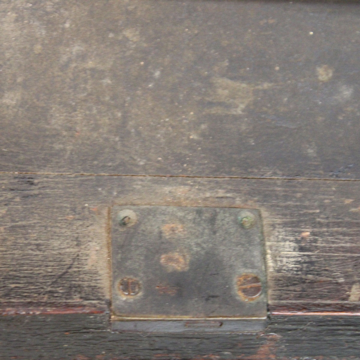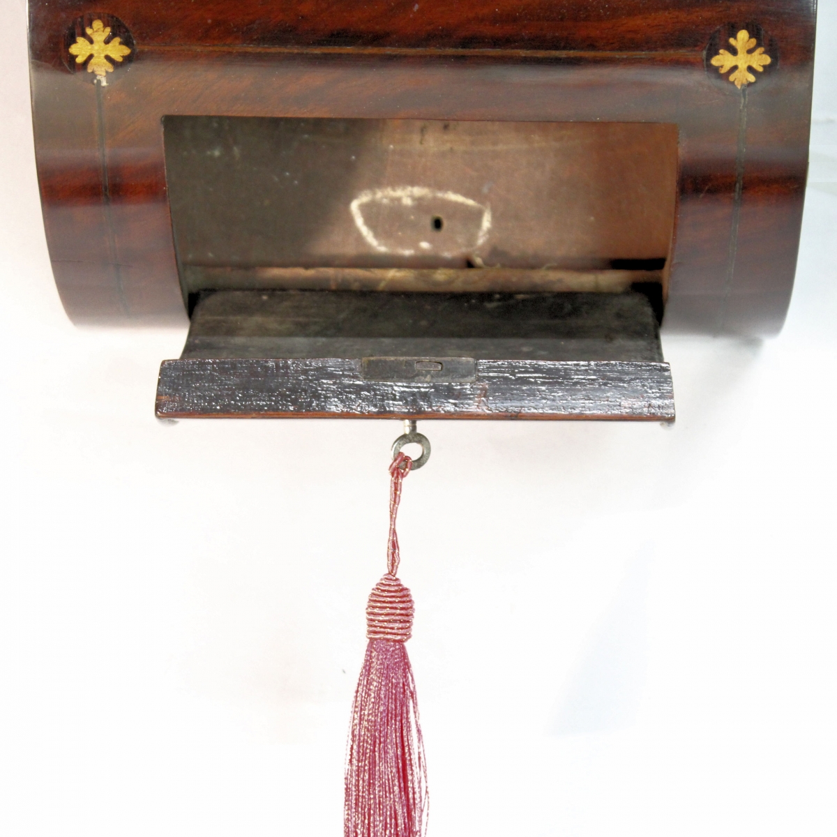 Contained in a dark mahogany 'drop' or 'trunk' case. The 3-piece pegged-on dial surround has a well executed, cushion shape moulded edge. The trunk or back box has hinged and toggled access doors to both sides and it is flanked with carved fan shaped 'ears' below the dial surround. The front has sycamore roundels and stringing inlay over a 3-sided moulding that breaks it from the quarter rounded, back-to-the-wall bottom that has a curved, cockbeaded and locking regulation door also, conforming roundels and stringing.